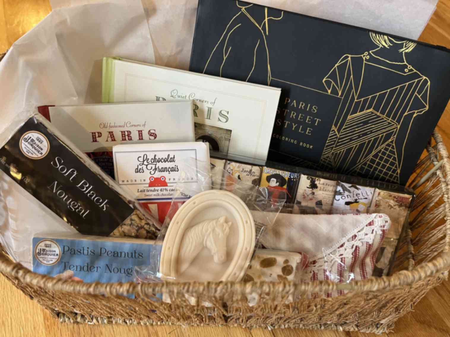 There is a little something for everyone in this basket of French goodies, including two charming travel books about Paris, a Paris-street style coloring book, chocolates by Du Plessis, chocolates by Le Chocolat des Francais, two nougats from Aix en Provence, soap from Pré de Provence, and a handmade lavender sachet made with French ticking.