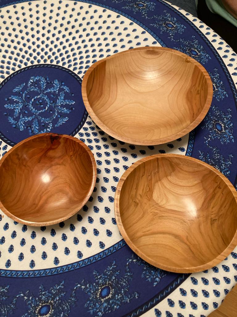 Receive a set of three nesting solid cherry-wood bowls. They have been handcrafted by a local artist from sustainably sourced wood. Cherry wood is a symbol of spring, love, and renewal.